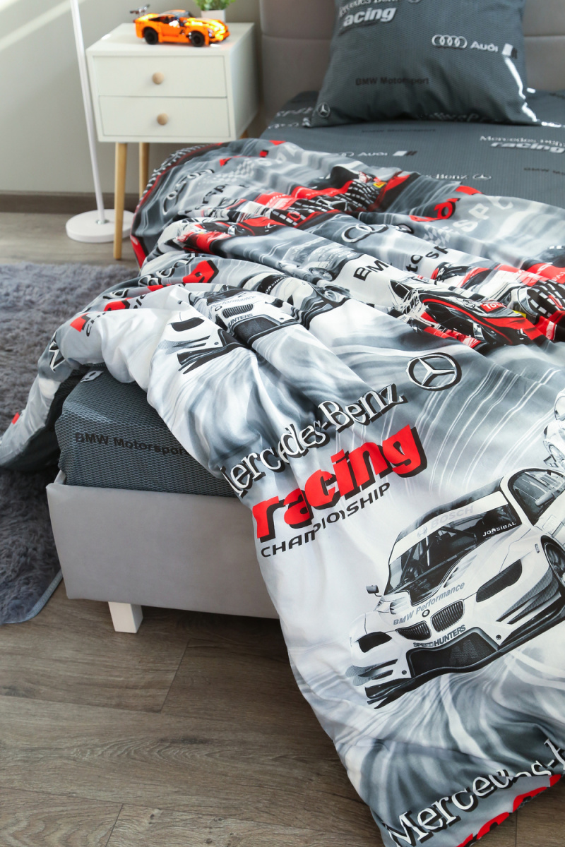 Дизайн с современным принтом автомобилей (Mercedes, Audi, BMW) добавляет интерьеру яркости и индивидуальности. Серебристый оттенок сочетается с классическими и современными стилями оформления.