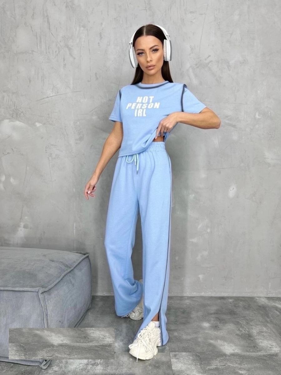 Женский костюм выполнен из футера высокого качества с хлопком и небольшим добавлением полиэстера и лайкры, что позволяет изделию не скатываться и оставлять идеальный внешний вид на долгое время. Костюм состоит из футболки с принтом и брюк с разрезами по бокам. Брюки на резинке с вместительными боковыми карманами.